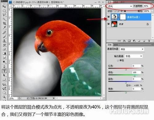 4、将这个图层的混合模式改为“点光”,不透明度改为:40%,这个图层与背景图层混合,我们又得到了一个细节丰富的彩色图像。